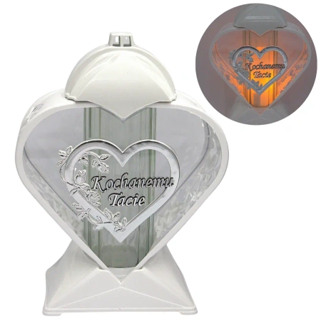 Nowoczesny znicz w kształcie serca wykonany z trwałego tworzywa i szkła. Srebrna aplikacja z napisem „Kochanemu Tacie” sprawia, że znicz ten jest idealnym symbolem pamięci i szacunku. Biało-srebrne wykończenie oraz wysoki połysk dodają mu elegancji i podniosłego charakteru.