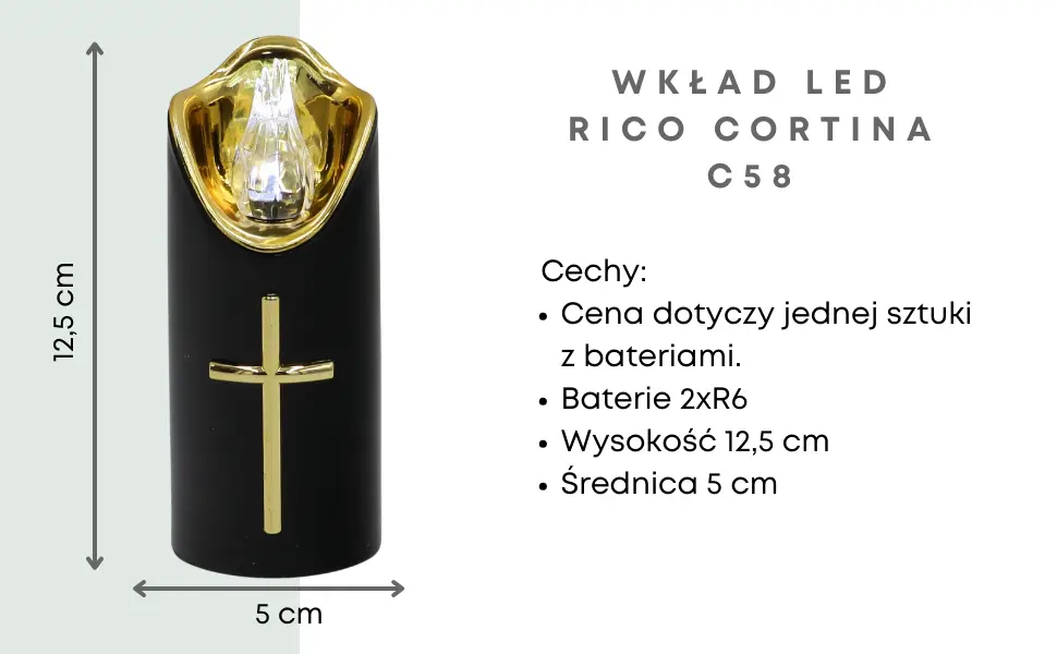 - Cortina Świeca Wkład do Zniczy Led Rico 12,5cm Czarno Złoty Krzyż Biały Płomień C58. Cena dotyczy jednej sztuki z bateriami 2xR6 Gratis! Wysokość 12,5 cm, średnica 5 cm. Wysokiej jakości wkład, który sprawdzi się w różnych warunkach atmosferycznych.