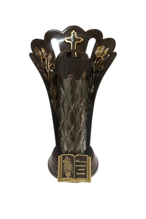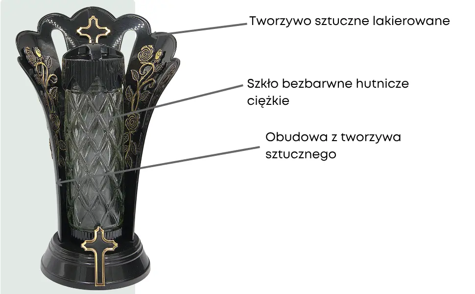 Znicz o wyjątkowym kształcie z dekoracyjną ramą i ciężkim szkłem hutniczym. Solidna konstrukcja z tworzywa sztucznego i szkła nadaje zniczowi niepowtarzalnego wyglądu. Doskonały wybór na Wszystkich Świętych, rocznice oraz jako stała ozdoba grobu.