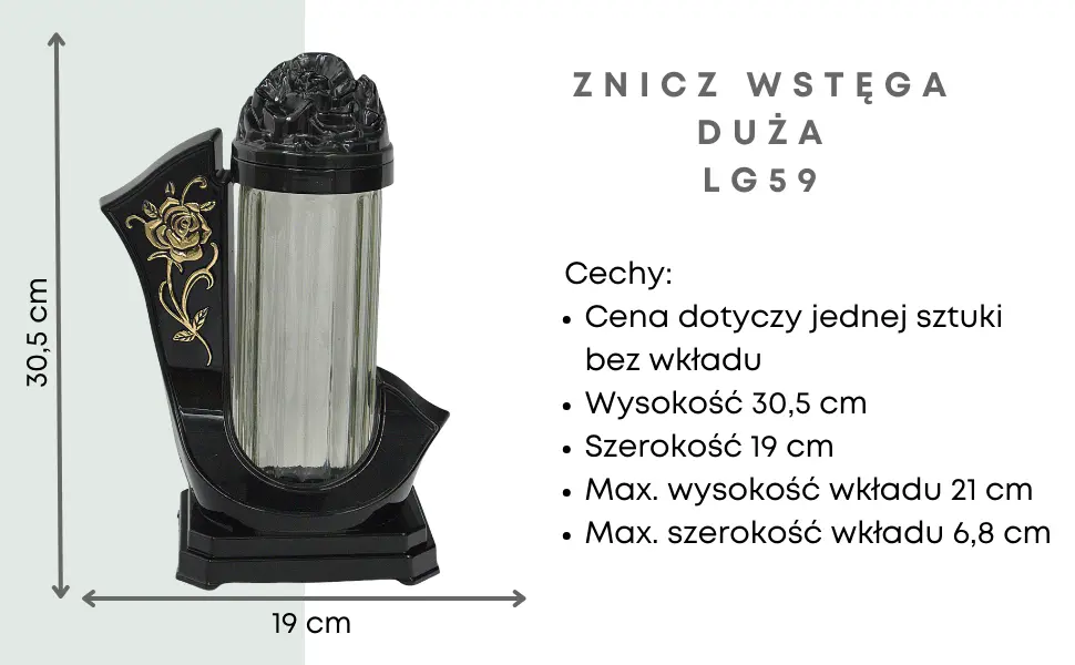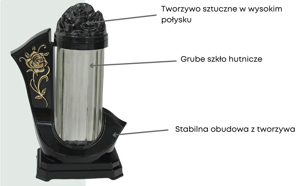 - Stylowy znicz z charakterystyczną boczną aplikacją w kształcie róży to idealna propozycja na grób bliskiej osoby. Nowoczesna forma i wytrzymałe materiały czynią go wyjątkową dekoracją, która podkreśla powagę miejsca pamięci.