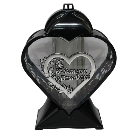 Elegancki, artystyczny znicz w kształcie serca wykonany z trwałego tworzywa w czarnym połysku i wysokiej jakości szkła hutniczego. Na froncie znajduje się dekoracyjna aplikacja 3D z napisem „Kochanemu Dziadkowi”, która nadaje zniczowi wyjątkowego, sentymentalnego charakteru. Produkt sprzedawany jest bez wkładu — możesz dobrać wkład według własnych preferencji.