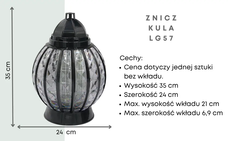 Znicz LG57 to duży model o kulistym kształcie, który przyciąga uwagę pięknym, szlifowanym szkłem oraz artystyczną obudową z tworzywa. Transparentne szkło z geometrycznym wzorem pięknie rozprasza światło, tworząc efekt elegancji i głębi.