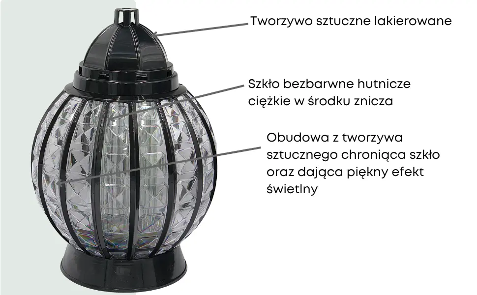 - Nowoczesny znicz w formie czarnej kuli z grubym szkłem hutniczym w środku. Stylowe połączenie połyskującej obudowy i geometrycznej struktury szkła zapewnia efektowny wygląd nawet bez światła. Idealny wybór jako całoroczna ozdoba nagrobna.
