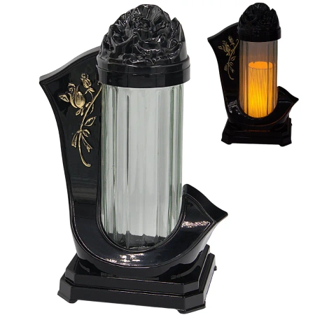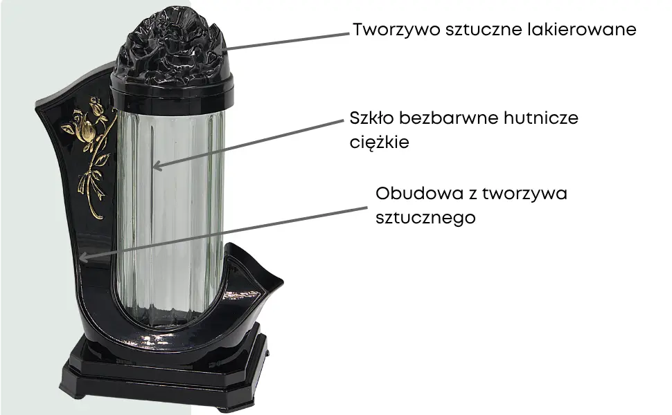 - Imponujący znicz o solidnej konstrukcji i dekoracyjnym motywie róży w złotym kolorze. Wykonany z trwałego tworzywa i grubego szkła hutniczego. Doskonale prezentuje się na nagrobku, stanowiąc symbol pamięci i szacunku przez cały rok.