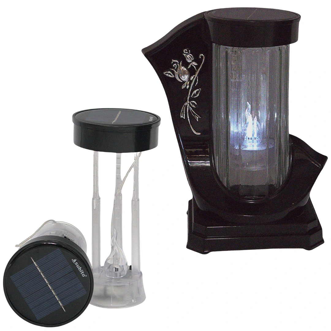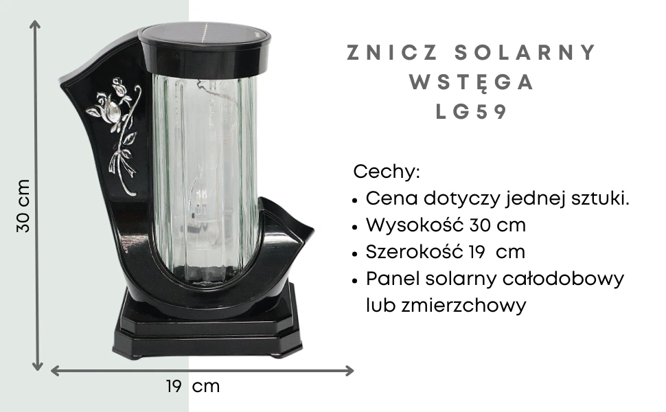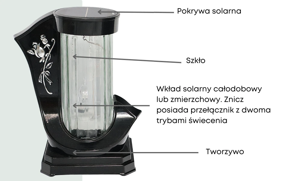 - Imponujący znicz solarny o solidnej konstrukcji i dekoracyjnym motywie róży w srebrnym kolorze. Wykonany z trwałego tworzywa i grubego szkła hutniczego. Doskonale prezentuje się na nagrobku, stanowiąc symbol pamięci i szacunku przez cały rok.