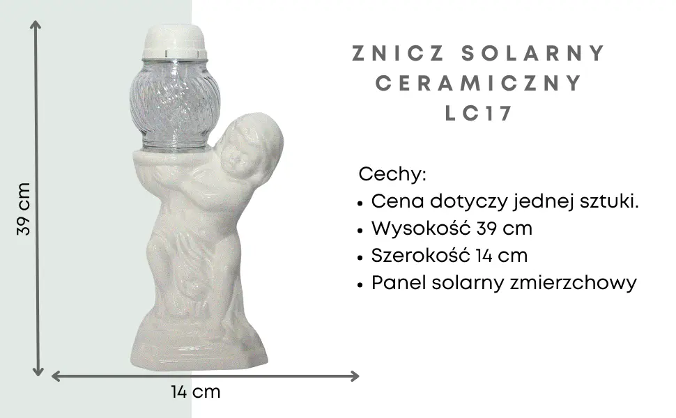 - Znicz Solarny Ceramiczny Anioł Duży Biały LC17 - znicz trzymany przez aniołka z wysokiej jakości ceramiki. Ceramika nie jest odporna na ujemne temperatury! Wymiary: 42 x 14 cm, maksymalna wysokość wkładu to 9 cm. Cena dotyczy 1 sztuki. Jednolity kolor.