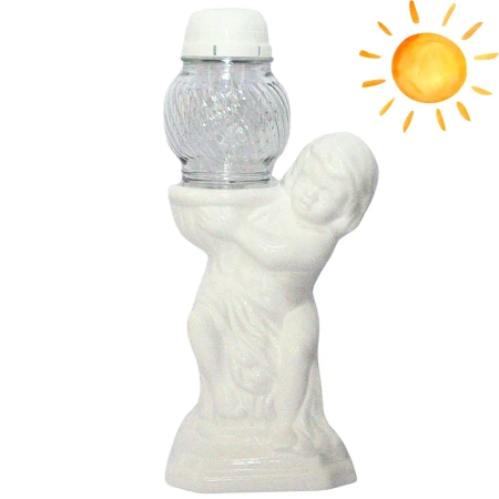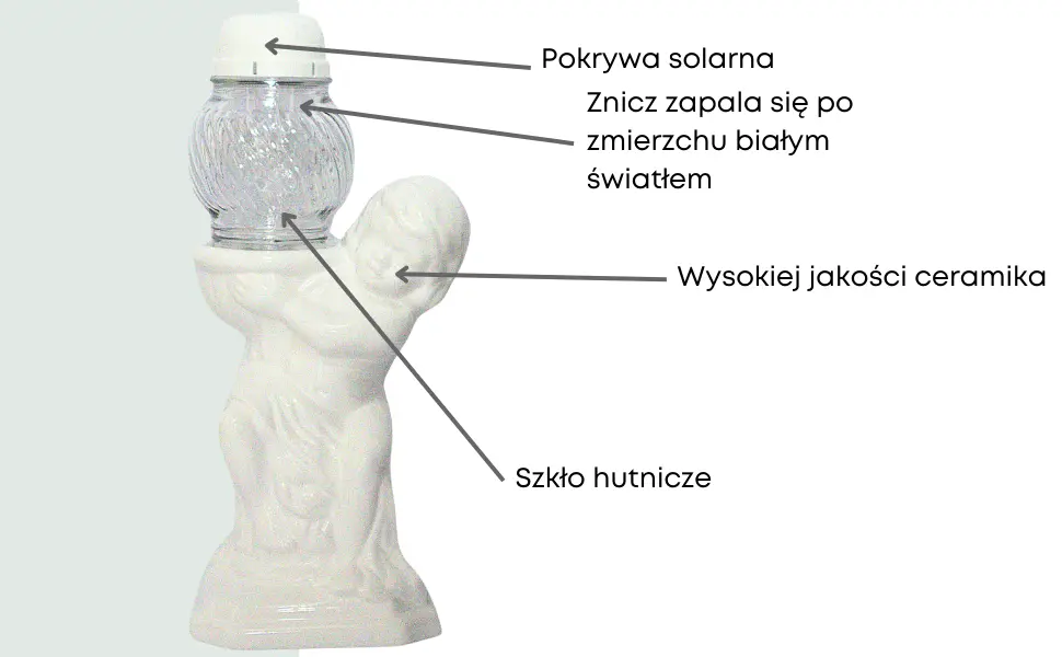 Elegancki znicz solarny w kształcie aniołka trzymającego szklaną kulę, wykonany z wysokiej jakości białej ceramiki. Dzięki zastosowaniu panelu zmierzchowego, światło zapala się automatycznie po zmroku i emituje jasne, białe światło – bez konieczności używania baterii czy wkładów. Idealny wybór dla tych, którzy cenią estetykę i symbolikę pamięci.
