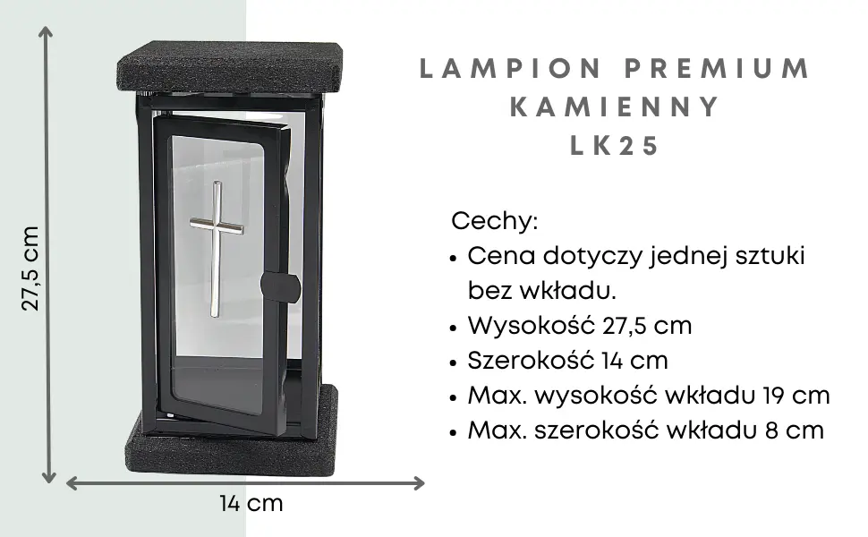 Solidny znicz nagrobny w formie lampionu, wykonany z połączenia żywicy i kamienia, z metalową kapliczką i transparentnym szkłem. Dzięki swojej ciężkiej konstrukcji oraz otwieranym drzwiczkom jest zarówno trwały, jak i funkcjonalny. Pasuje do różnych rodzajów nagrobków – klasycznych i nowoczesnych.