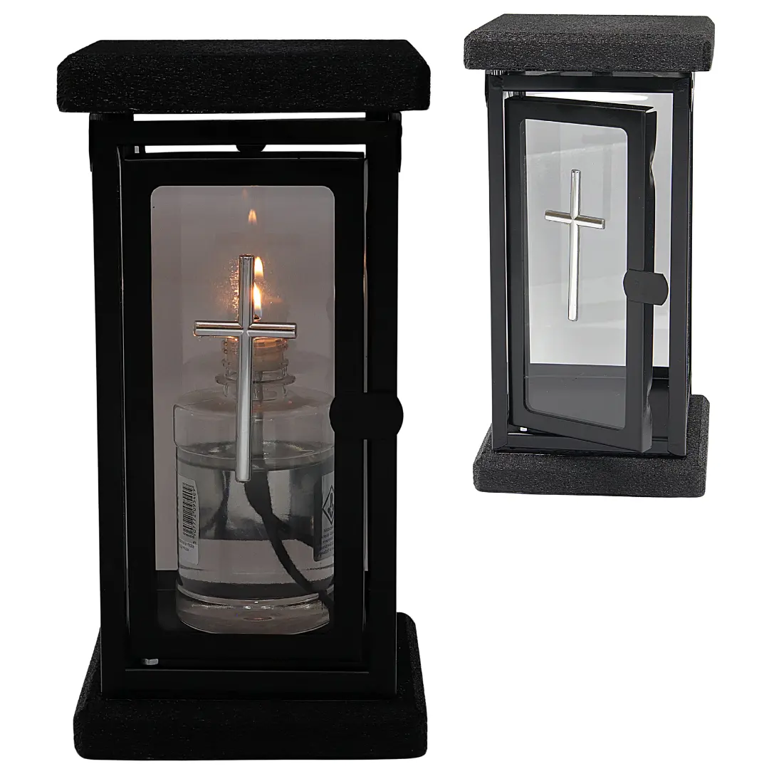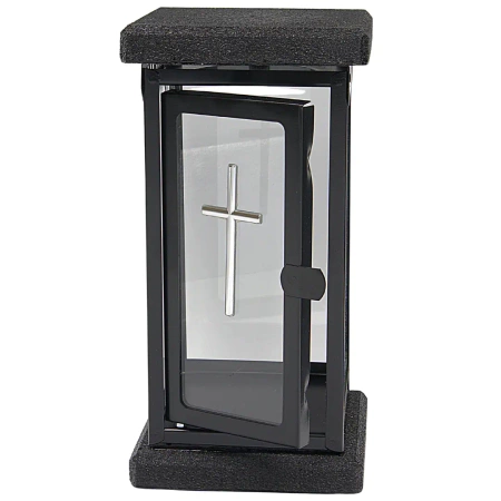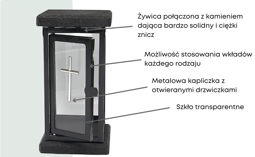 - Solidny znicz nagrobny w formie lampionu, wykonany z połączenia żywicy i kamienia, z metalową kapliczką i transparentnym szkłem. Dzięki swojej ciężkiej konstrukcji oraz otwieranym drzwiczkom jest zarówno trwały, jak i funkcjonalny.