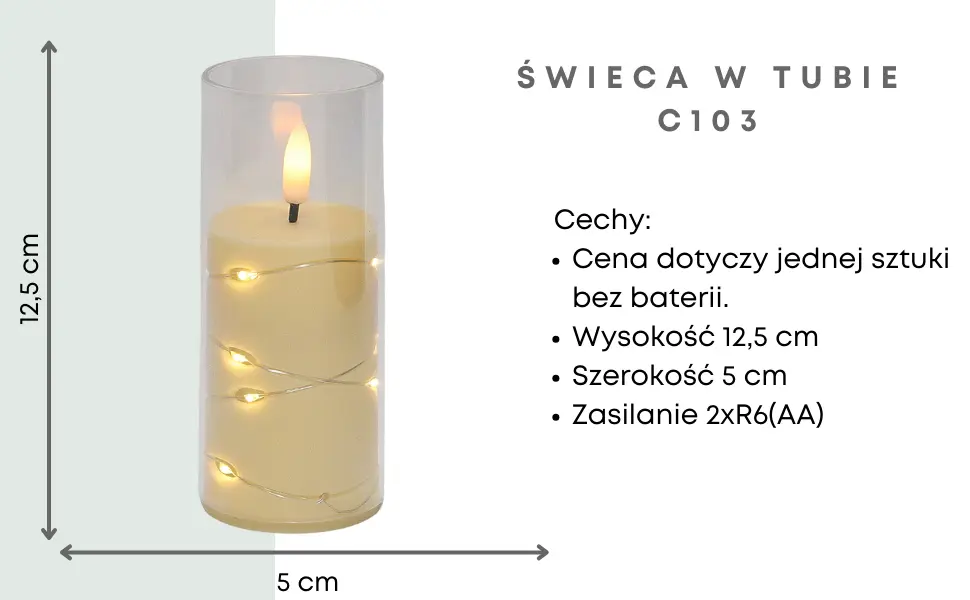 Świeca C103 to elegancka alternatywa dla tradycyjnych świec – bez ryzyka ognia czy kapania wosku. Dzięki subtelnej, ciepłej poświacie idealnie sprawdza się jako dekoracja wewnętrzna, świąteczna lub jako symboliczny znicz LED. Wygodne zasilanie bateryjne i kompaktowe wymiary sprawiają, że jest praktyczna i uniwersalna.