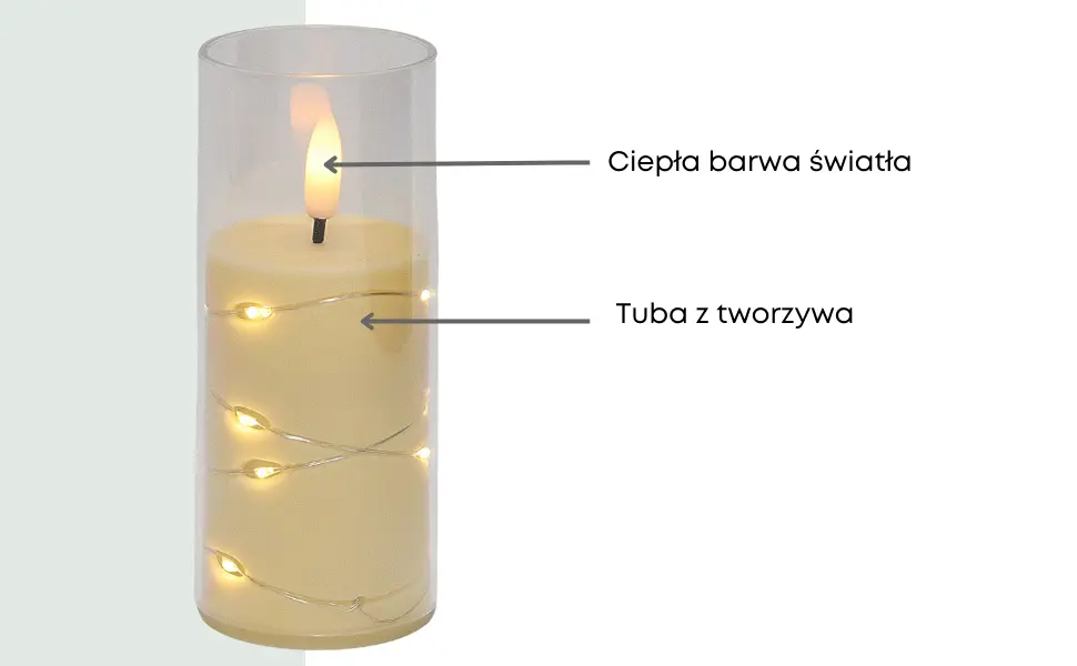 - Dekoracyjna świeca LED umieszczona w przezroczystej tubie to doskonały wybór dla osób ceniących nowoczesne rozwiązania w klasycznym stylu. Dzięki ciepłej barwie światła LED tworzy przytulną atmosferę, idealną do użytku domowego lub dekoracji nagrobnych.