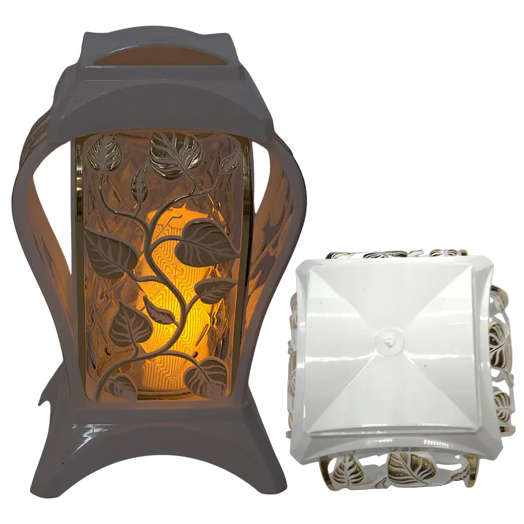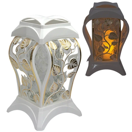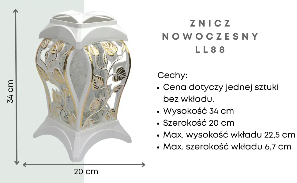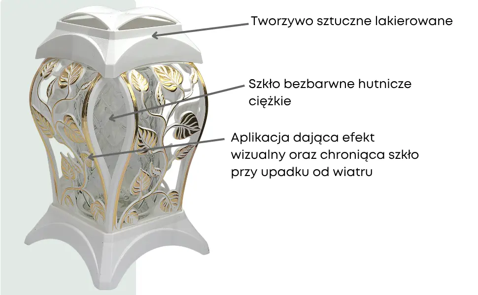 - Dekoracyjny znicz w nowoczesnej formie z gustownym połączeniem białego lakieru i złotych aplikacji. Wykonany z trwałego tworzywa oraz ciężkiego szkła hutniczego, znakomicie sprawdzi się jako całoroczna ozdoba nagrobna.