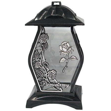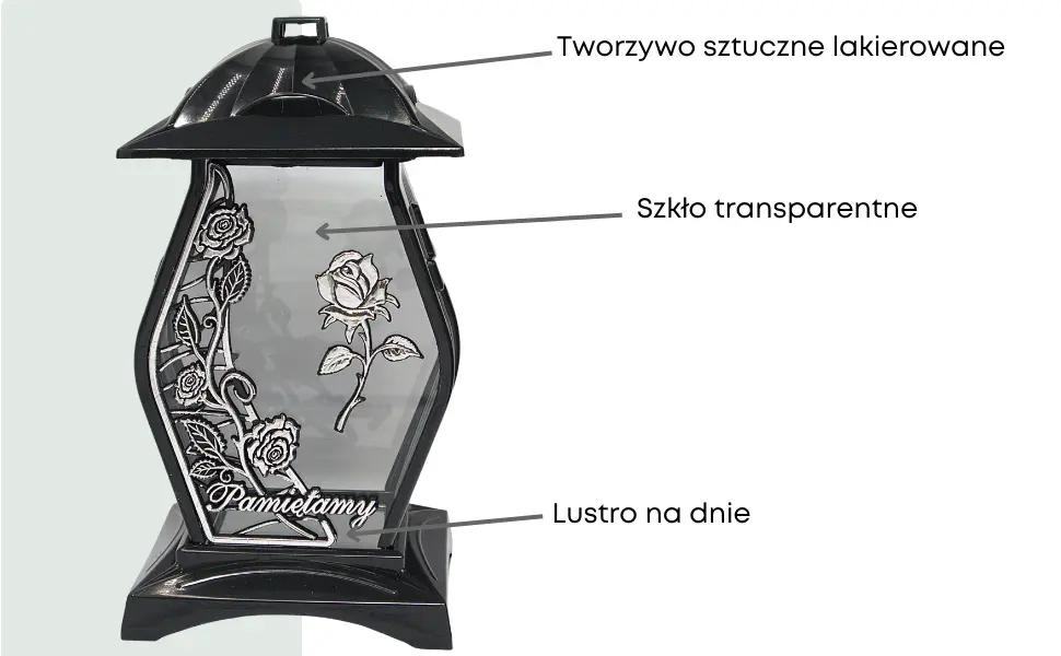 Dekoracyjny znicz nagrobny w formie lampionu, wykonany z lakierowanego tworzywa sztucznego w jasnym kolorze. Transparentne szkło eksponuje światło płomienia, a srebrna aplikacja 3D w kształcie róży z napisem Pamiętamy nadaje całości uroczysty, podniosły charakter. Lustro na spodzie wzmacnia efekt świetlny, tworząc wrażenie głębi.
