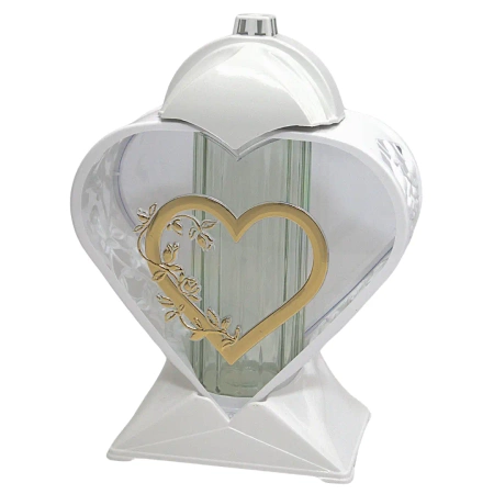 Nowoczesny znicz artystyczny w kształcie serca z delikatną biało-złotą aplikacją. Wykonany z wysokiej jakości szkła i tworzywa w połysku. Doskonały wybór dla osób, które cenią estetykę i trwałość. Duża komora pozwala na stosowanie różnych rodzajów wkładów.