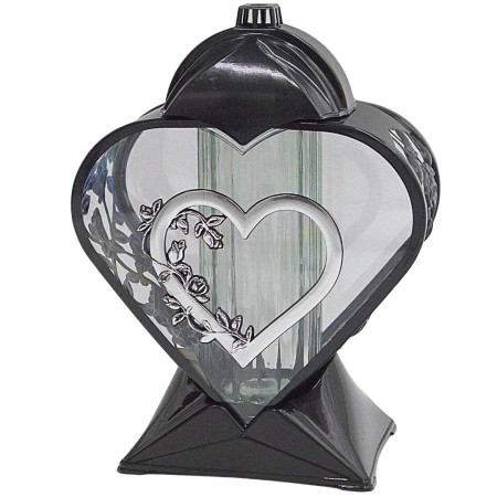 Znicz LL87 wyróżnia się artystycznym kształtem serca z dekoracyjnym szkłem hutniczym w środku. Obudowa wykonana z tworzywa sztucznego w połyskującym czarno-srebrnym wykończeniu nadaje mu elegancki i nowoczesny wygląd.