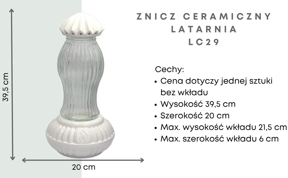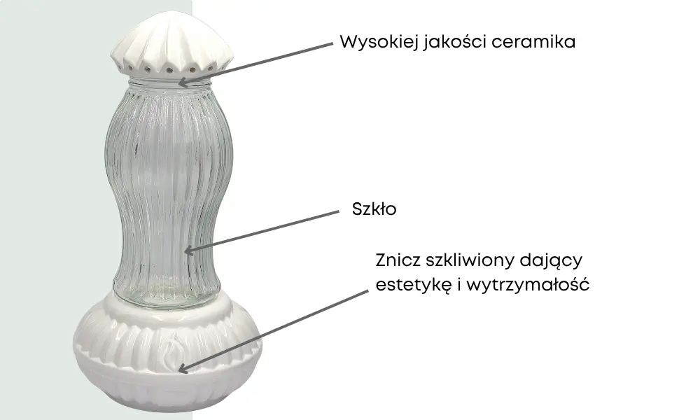 - Stylowy znicz w formie latarni, wykonany z wysokiej jakości ceramiki i szkła. Śnieżnobiała kolorystyka podkreśla jego elegancki charakter, czyniąc go idealnym wyborem na grób bliskiej osoby. Doskonała trwałość i estetyka.