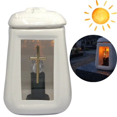 Elegancki znicz ceramiczny w klasycznym białym kolorze z wbudowanym złotym krzyżem i przezroczystym okienkiem ze szkła. W zestawie znajduje się wkład solarny z ruchomym światłem, który ładuje się w ciągu dnia i świeci również za dnia – nie tylko po zmroku. Całość wykonana z wysokiej jakości ceramiki – trwałej i estetycznej.