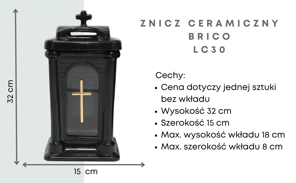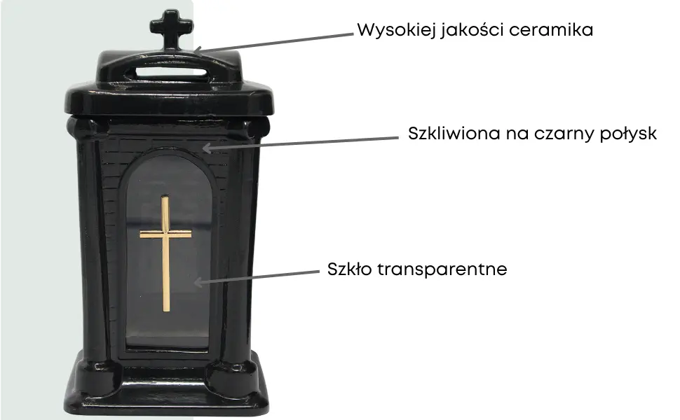 - Elegancki znicz ceramiczny wykonany z wysokiej jakości ceramiki szkliwionej na czarny połysk. Transparentne szkło z przodu eksponuje wewnętrzny krzyż i zabezpiecza płomień. Świetny wybór na każdą porę roku – solidny i odporny na warunki atmosferyczne.