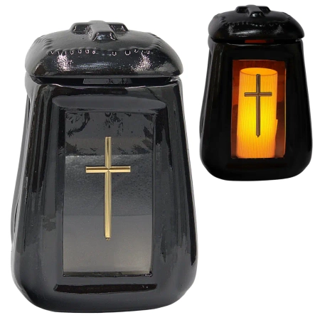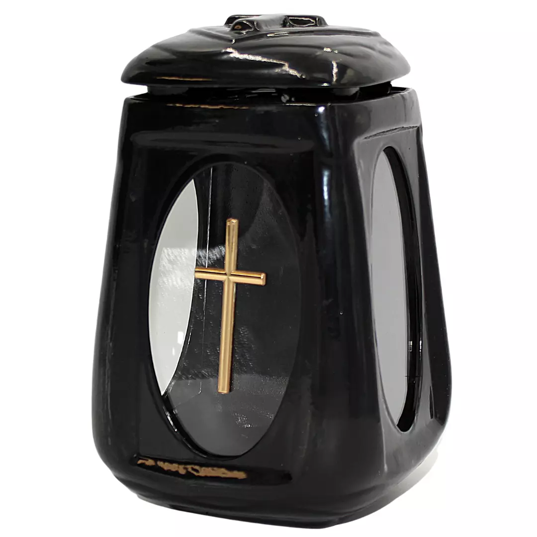 Znicz Ceramiczny Czarny Połysk Beczka Worek z Krzyżem Złotym ZC23