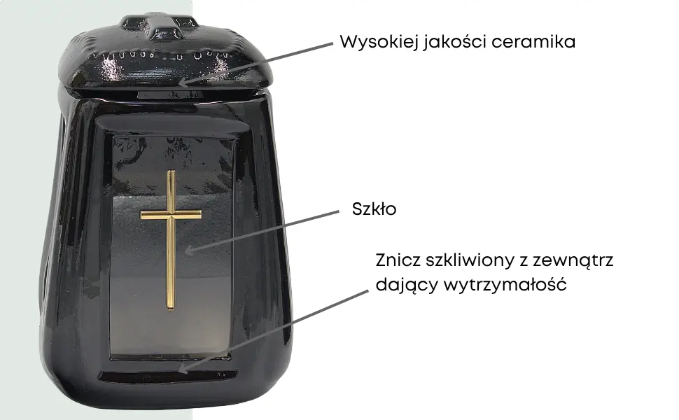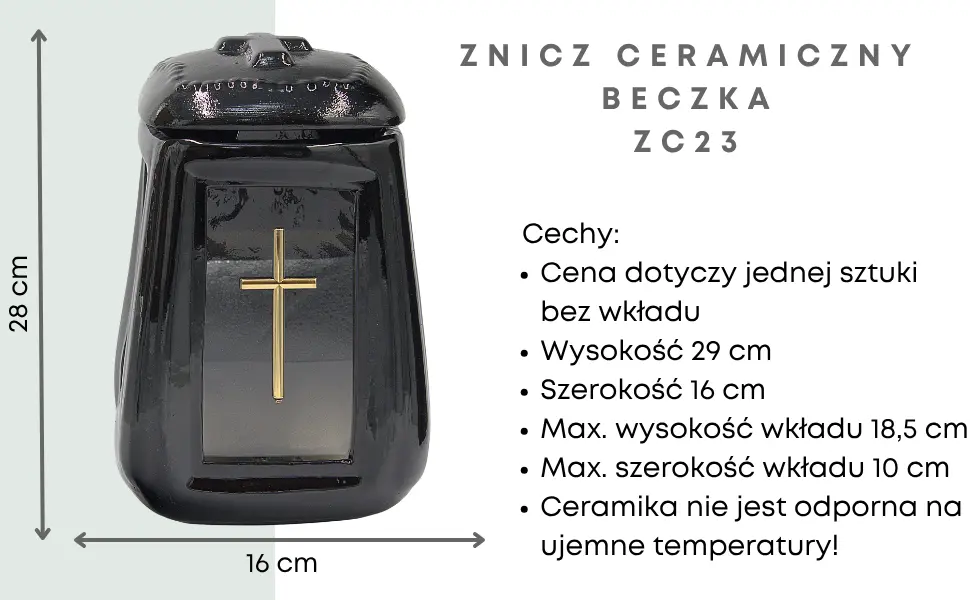 - Elegancki znicz ceramiczny w kształcie beczki, wykonany z wysokiej jakości szkliwionej ceramiki w głębokim czarnym kolorze. Idealny na każdą porę roku (poza zimą), stanowi ponadczasowy symbol pamięci o bliskich.