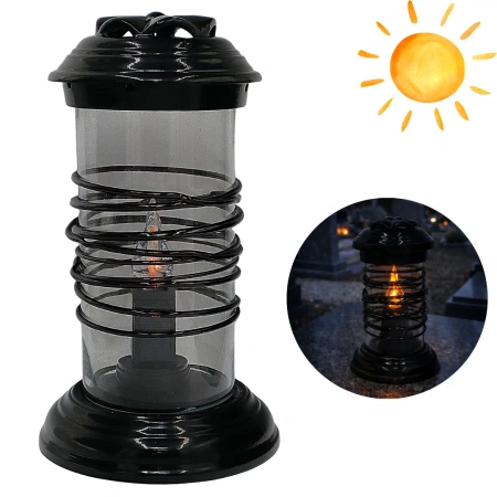 Elegancki znicz solarny wykonany z wysokiej jakości ceramiki oraz szkła hutniczego. Charakteryzuje się nowoczesną formą z dekoracyjną owijką szklaną. Wyposażony we wkład solarny całodobowy z efektem ruchomego płomienia, który świeci również w dzień. Praktyczna budowa pozwala na łatwe wyciąganie wkładu i jego wymianę.