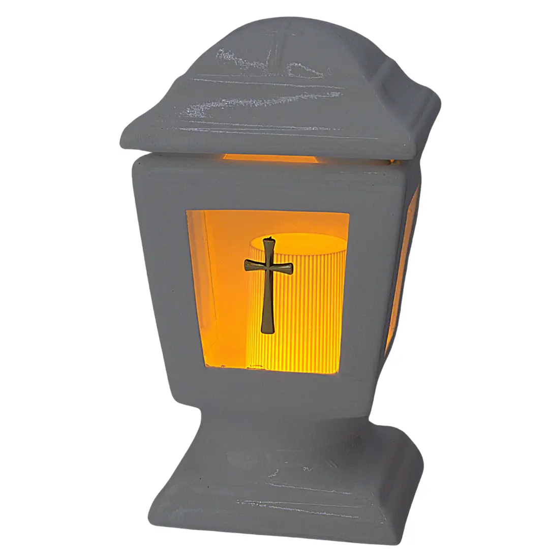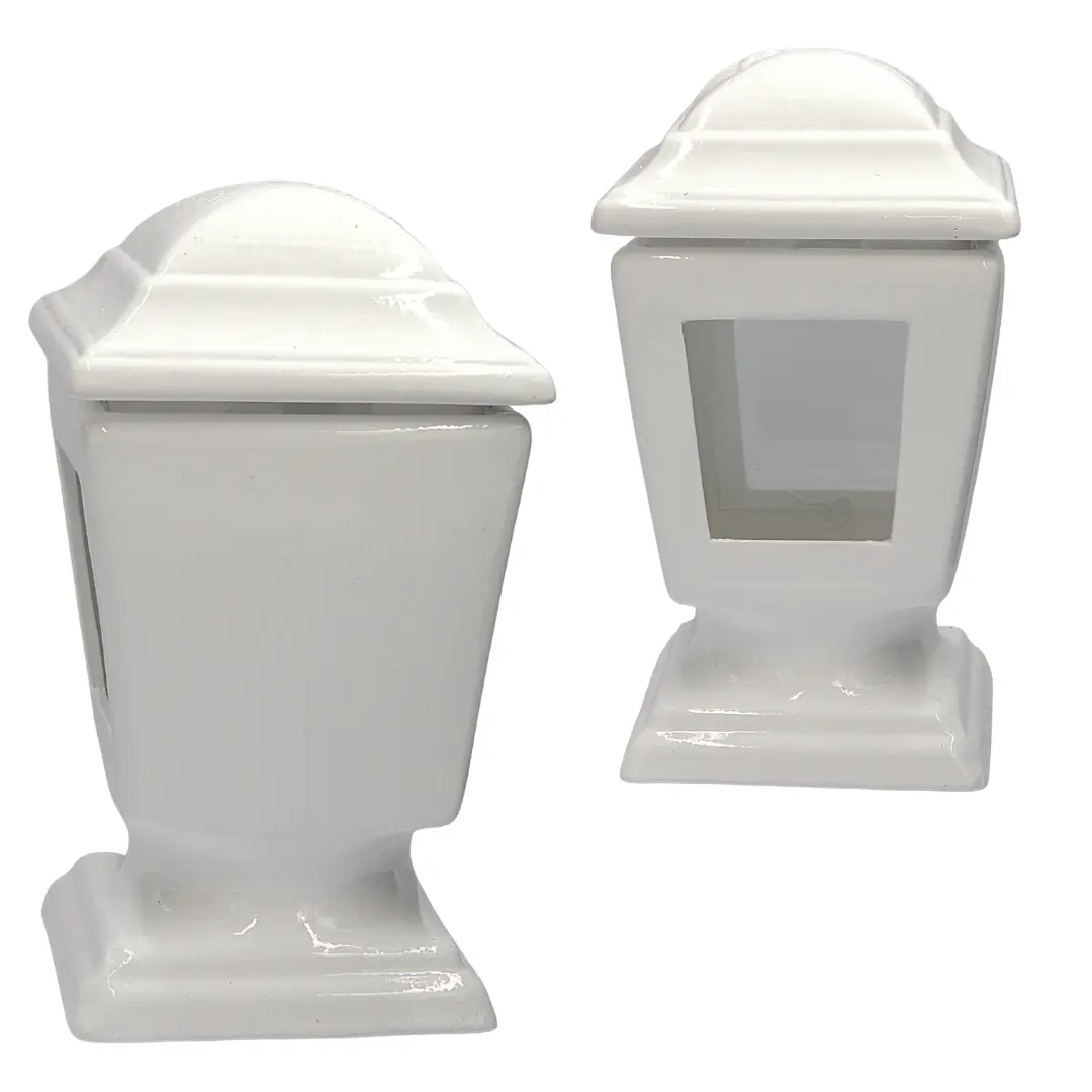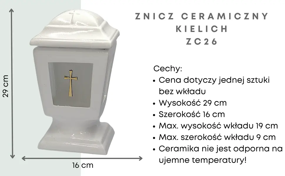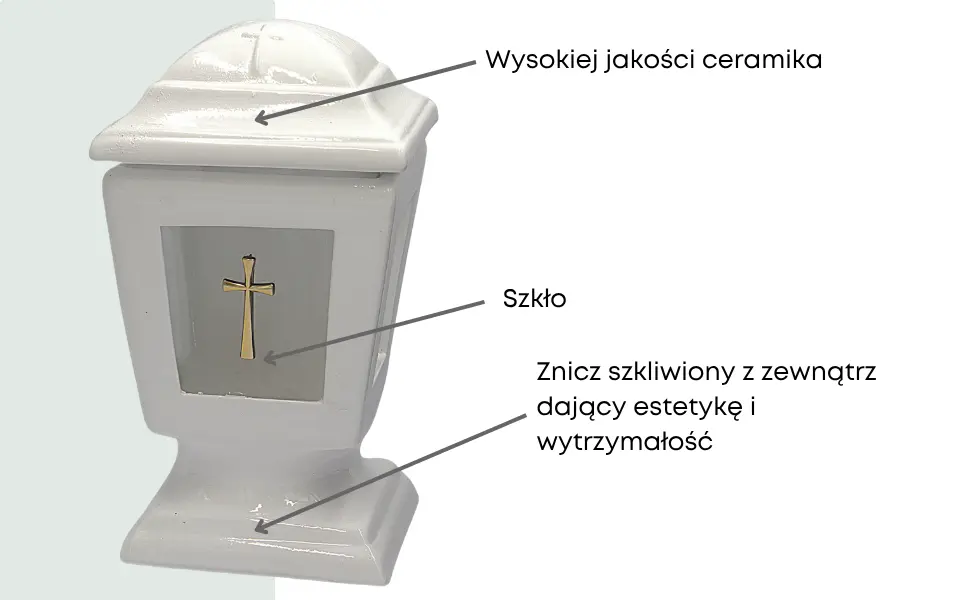 - Biały znicz ceramiczny w klasycznej formie kielicha to propozycja dla osób ceniących stonowaną elegancję i symbolikę. Połyskująca ceramika oraz szkło z krzyżem tworzą spokojną i uroczystą kompozycję, idealną na każdą okazję pamięci.