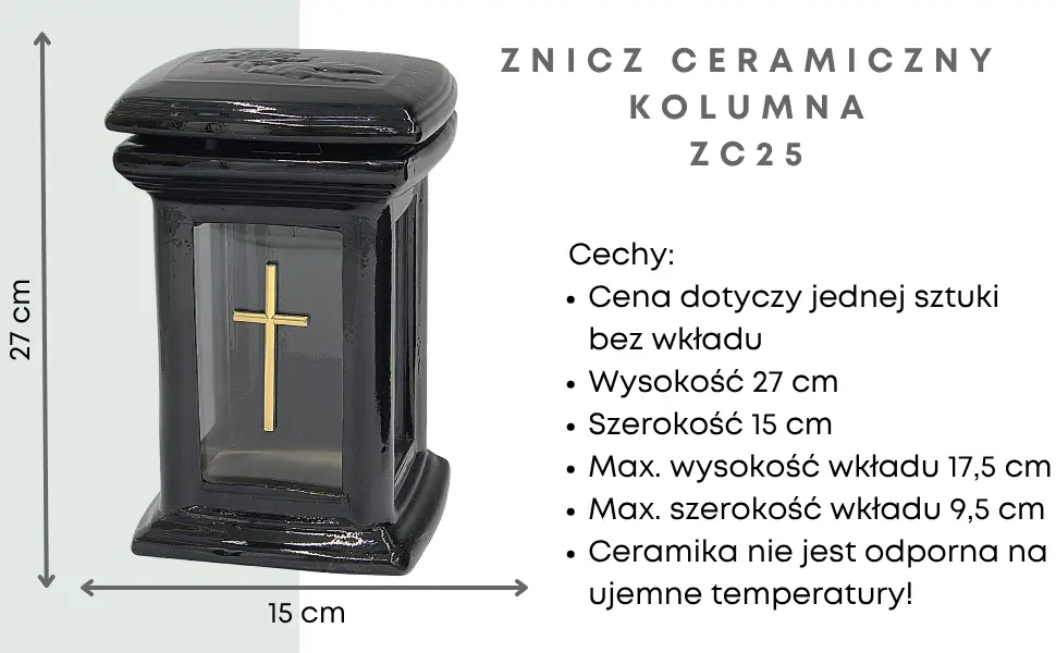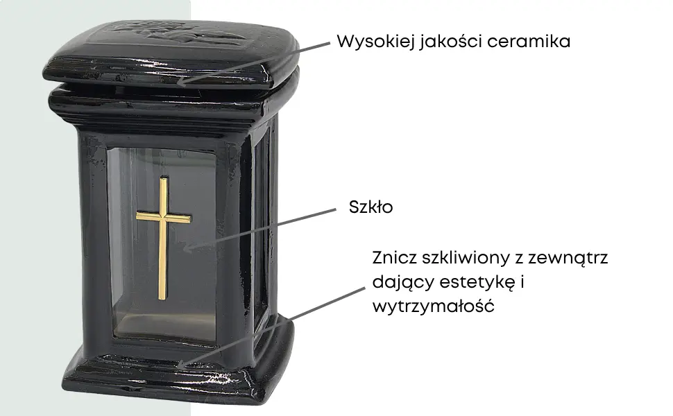 - Znicz o kształcie kolumny wykonany z wysokiej jakości ceramiki. Głęboka czerń, szkliwiona powierzchnia i wkomponowany złoty krzyż czynią go wyjątkowym dodatkiem do miejsca pamięci. Solidne wykonanie gwarantuje trwałość i estetykę.