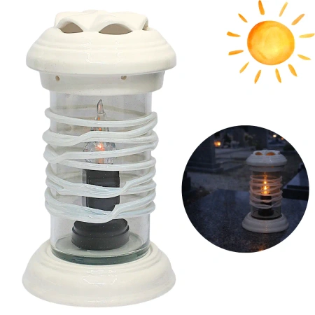 Elegancki znicz o nowoczesnym designie, wykonany z wysokiej jakości białej ceramiki i szkła hutniczego. Charakterystyczna szklana owijka nadaje mu oryginalny i stylowy wygląd. W komplecie znajduje się całodobowy wkład solarny imitujący naturalny płomień – działa również w dzień.