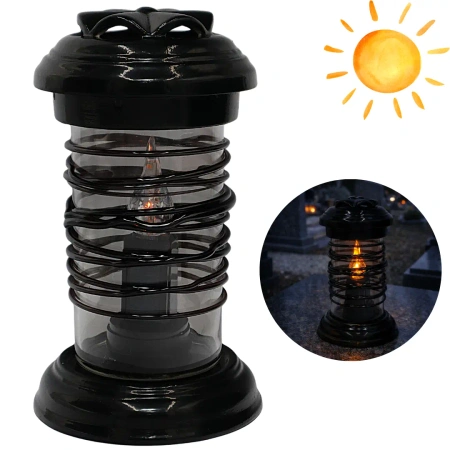 Znicz ceramiczny w nowoczesnym stylu, wykonany z wysokiej jakości czarnej ceramiki oraz szkła hutniczego. Efektowna, dekoracyjna owijka szklana nadaje zniczowi unikalny wygląd. W zestawie znajduje się całodobowy wkład solarny z efektem ruchomego płomienia, który działa zarówno w dzień, jak i po zmroku.