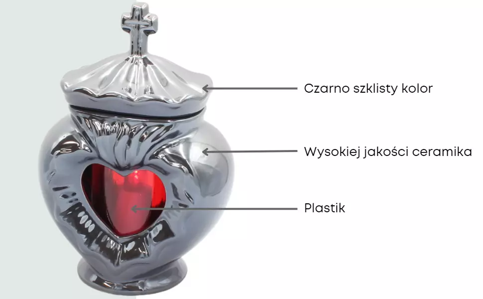 Elegancki znicz wykonany z wysokiej jakości ceramiki w kształcie serca. Pokryty efektownym szkliwem w kolorze grafitowym z połyskiem, z dekoracyjnym czerwonym sercem wewnątrz. Idealny wybór dla tych, którzy szukają niebanalnego i trwałego znicza na cmentarz.