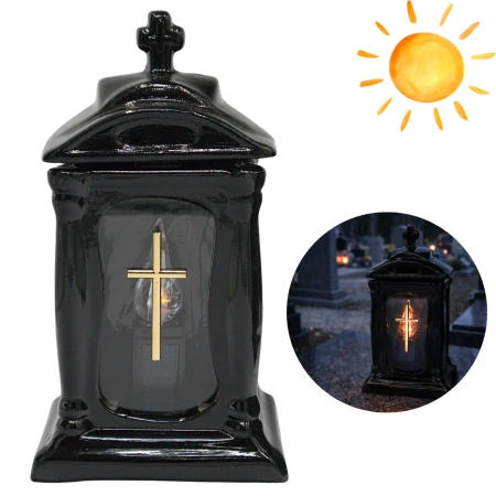Klasyczny znicz ceramiczny w formie kapliczki, wykonany z wysokiej jakości czarnej ceramiki. Przeszklone okienko z widocznym złotym krzyżem dodaje całości podniosłego, eleganckiego charakteru. Znicz wyposażony jest w wyjmowany wkład solarny z efektem ruchomego płomienia, który świeci zarówno w dzień, jak i w nocy.