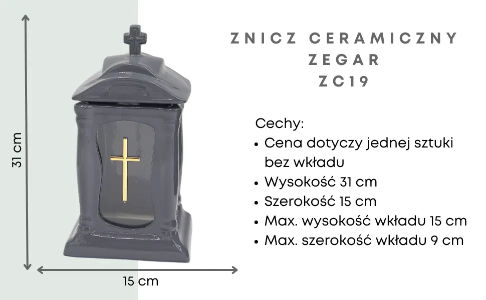 Model ZC19 przypomina klasyczny zegar lub kapliczkę, co nadaje mu wyjątkowego, ponadczasowego charakteru. Front znicza wykonany jest z wysokiej jakości szkła, a wnętrze ozdobione eleganckim krzyżem w postaci naklejki. Otwór od góry pozwala łatwo wymieniać wkład – zarówno klasyczny parafinowy, jak i nowoczesny LED.