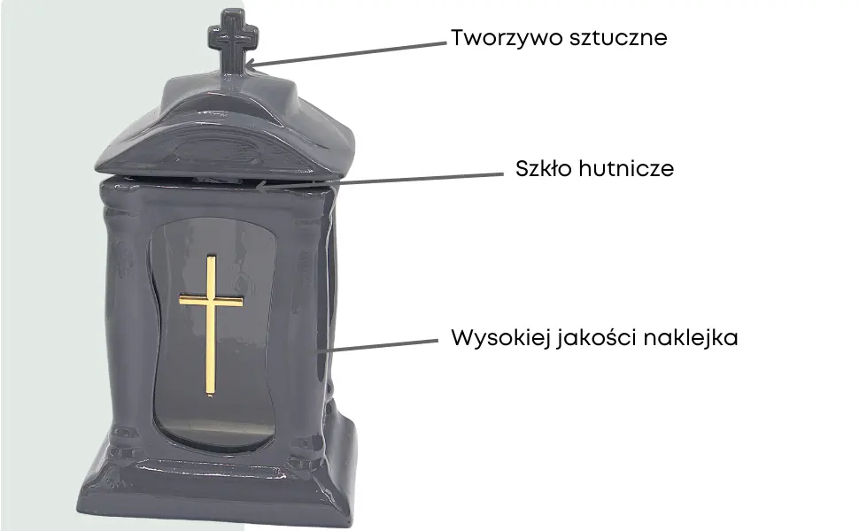 Znicz ZC19 łączy w sobie tradycyjny wygląd z nowoczesnym wykończeniem. Obudowa z tworzywa sztucznego i szkła hutniczego nadaje mu estetycznego charakteru, a wysoka jakość wykonania zapewnia odporność na zmienne warunki atmosferyczne. Złoty krzyż na froncie podkreśla symbolikę znicza.