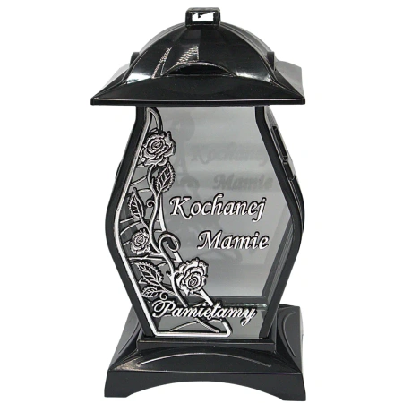 • Dekoracyjny znicz o atrakcyjnej, niestandardowej formie „diamentu” z efektem srebrnej aplikacji 3D i delikatnym kwiatowym motywem. Z przodu widnieje dedykacja „Kochanej Mamie – Pamiętamy”