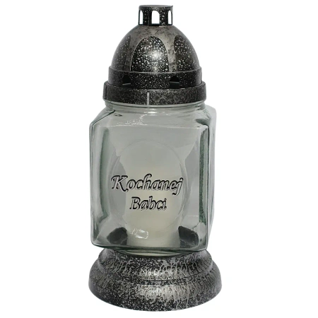 Tradycyjny znicz w klasycznym, prostym kształcie z szklanym kloszem i srebrnymi elementami pokrywy oraz podstawy. Na przedniej szybie znajduje się dekoracyjna aplikacja 3D z napisem „Kochanej Babci”, która doskonale podkreśla osobisty charakter produktu. Znicz sprzedawany jest z wkładem GRATIS, dzięki czemu jest gotowy do użycia od razu po zakupie.