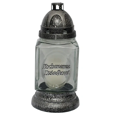 Klasyczny znicz w eleganckim stylu, wykonany z grubego szkła hutniczego oraz trwałego tworzywa w kolorze srebrnym. Front zdobi aplikacja 3D z napisem „Kochanemu Dziadkowi”, co czyni go doskonałym wyborem na Dzień Dziadka, Wszystkich Świętych lub inne dni pamięci. W komplecie znajduje się wkład parafinowy – gotowy do użycia od razu po zakupie.
