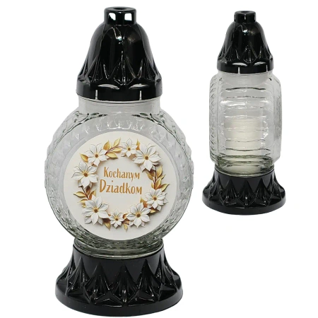 - Dekoracyjny znicz o tradycyjnym kształcie z przezroczystego szkła hutniczego i trwałego tworzywa. Zdobiony sentymentalną naklejką z napisem „Kochanym Dziadkom” i kwiatowym motywem.