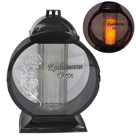 Elegancki znicz o klasycznym, okrągłym kształcie z dekoracyjną grafiką i srebrnym napisem „Kochanemu Tacie”. Wykonany z trwałego tworzywa odpornego na warunki atmosferyczne. We wnętrzu znajduje się szklana tuba, umożliwiająca stosowanie różnych rodzajów wkładów: parafinowych, LED czy solarnych.