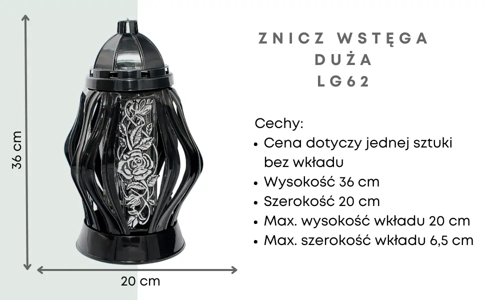 - Znicz LG62 przyciąga wzrok swoją nietypową formą i dekoracyjną aplikacją z motywem róż. Wysokiej jakości materiały – połyskujące tworzywo sztuczne i grube szkło hutnicze – zapewniają trwałość, estetykę i elegancki wygląd.