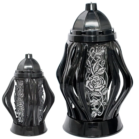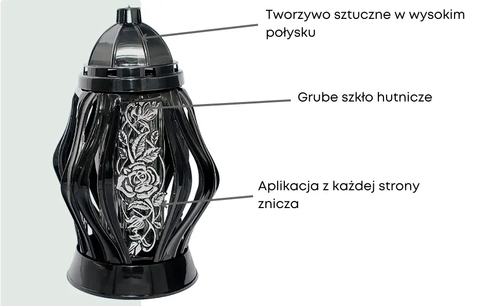 Znicz LG62 przyciąga wzrok swoją nietypową formą i dekoracyjną aplikacją z motywem róż. Wysokiej jakości materiały – połyskujące tworzywo sztuczne i grube szkło hutnicze – zapewniają trwałość, estetykę i elegancki wygląd.