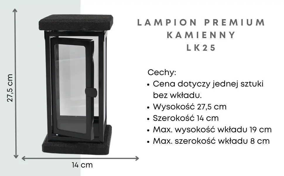 Model LK25 w wersji bez dodatkowych zdobień to znicz o czystej, nowoczesnej formie, zaprojektowany z myślą o użytkownikach ceniących elegancki minimalizm. Wykonany z żywicy połączonej z kamieniem, zapewnia wyjątkową trwałość i odporność na warunki atmosferyczne.