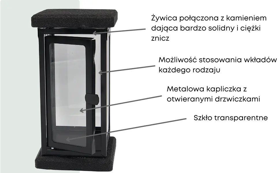 - Elegancki znicz nagrobny wykonany z połączenia żywicy i kamienia, wyposażony w otwieraną metalową kapliczkę z transparentnymi szybami.