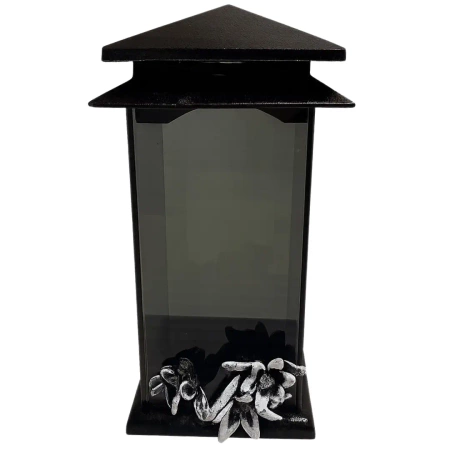 - Dekoracyjny znicz wykonany z mieszanki żywicy i kamienia, z grubym szkłem oraz estetyczną aplikacją w formie róż.