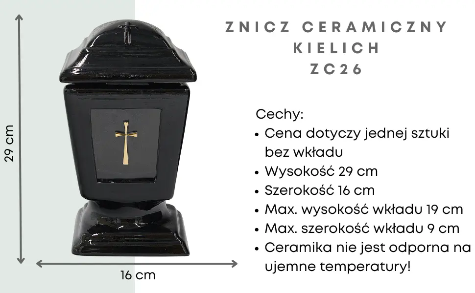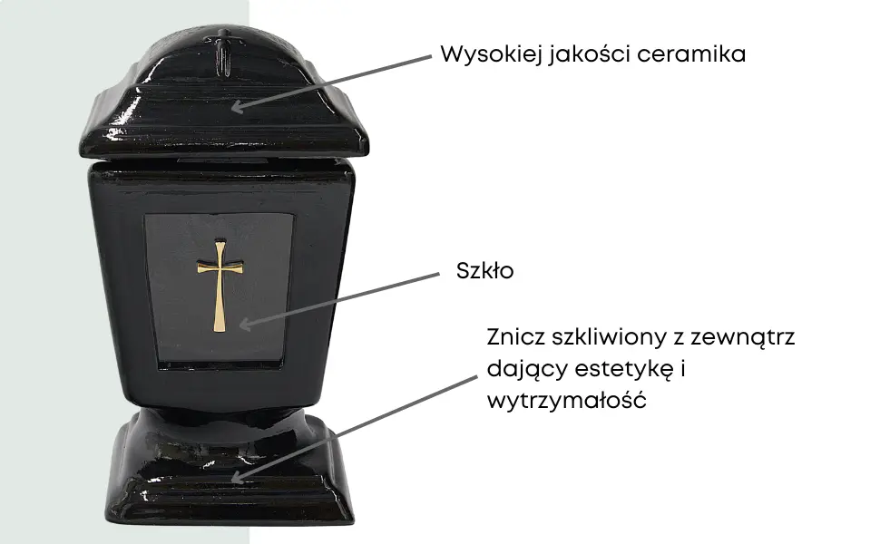 - Wysokiej jakości znicz ceramiczny w eleganckim czarnym kolorze, idealny jako dekoracja nagrobna. Klasyczny kształt kielicha z połyskiem i delikatnym przeszkleniem nadaje całości wyrazistości i trwałości. Znicz wykonany z glazurowanej ceramiki