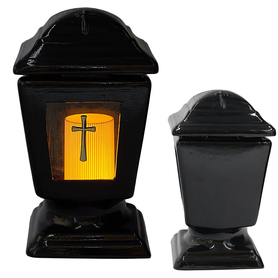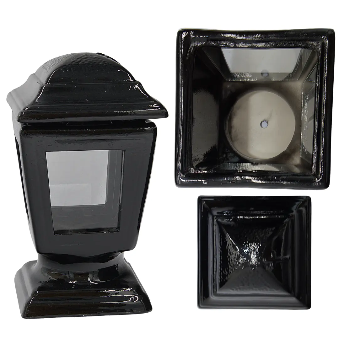 Wysokiej jakości znicz ceramiczny w eleganckim czarnym kolorze, idealny jako dekoracja nagrobna. Klasyczny kształt kielicha z połyskiem i delikatnym przeszkleniem nadaje całości wyrazistości i trwałości. Znicz wykonany z glazurowanej ceramiki – solidny i estetyczny wybór na każdą okazję.