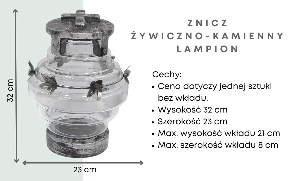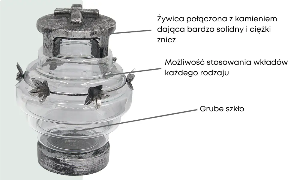 - legancki znicz w odcieniach srebra i przezroczystego szkła to połączenie tradycji z wyjątkową trwałością. Wykonany z grubego szkła hutniczego, żywicy oraz kamienia, wzbogacony o metalowy wianek i ciężką kamienną pokrywę z krzyżem.