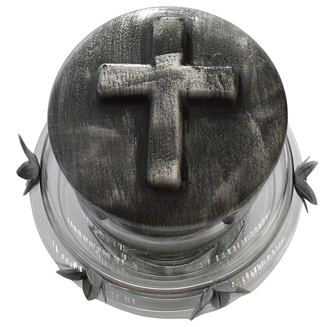 Elegancki znicz w odcieniach srebra i przezroczystego szkła to połączenie tradycji z wyjątkową trwałością. Wykonany z grubego szkła hutniczego, żywicy oraz kamienia, wzbogacony o metalowy wianek i ciężką kamienną pokrywę z krzyżem. Stabilny i efektowny – idealny na każdą porę roku.