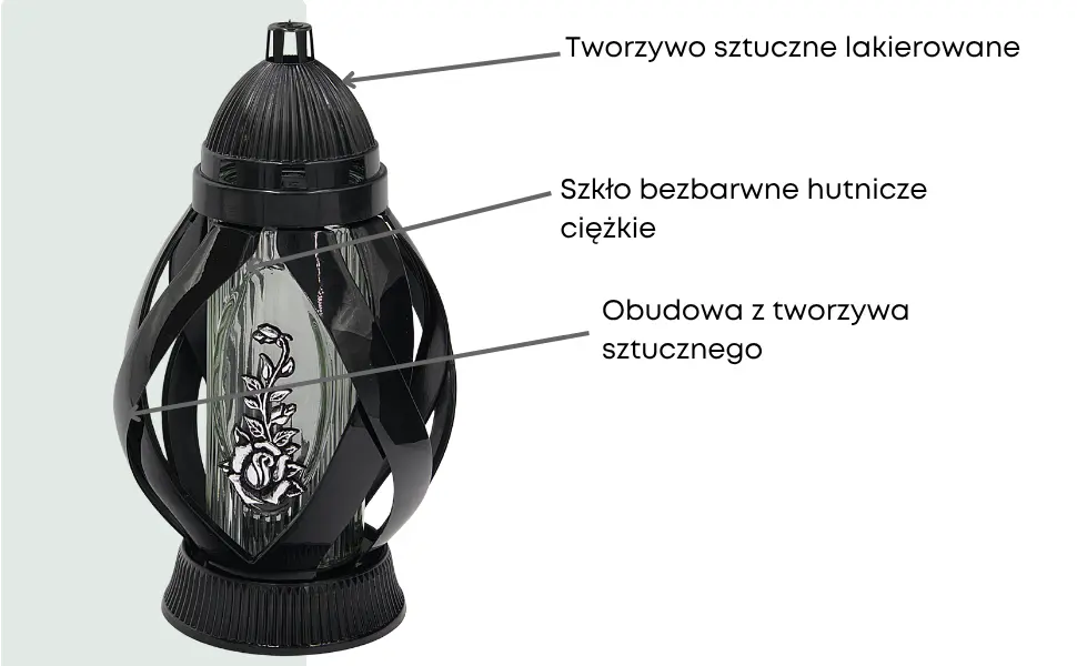 Nowoczesny znicz o wyjątkowej formie z przestrzenną obudową w stylu ażurowej wstęgi. Połączenie lakierowanego tworzywa i ciężkiego szkła hutniczego zapewnia trwałość i wyjątkowy efekt wizualny. Idealny na grób bliskiej osoby – całoroczna ozdoba o eleganckim charakterze.