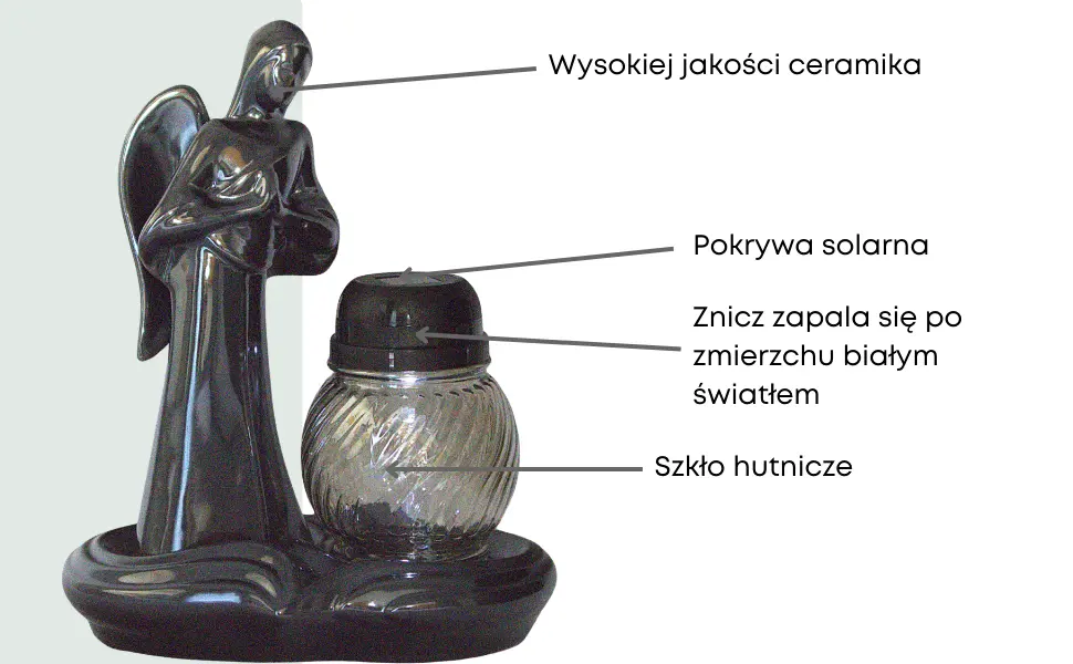Elegancki znicz solarny z figurą anioła, wykonany z trwałej ceramiki i szkła hutniczego. Czarna kolorystyka w połączeniu z nowoczesnym panelem zmierzchowym tworzy znicz o podniosłym charakterze, który po zmroku automatycznie rozświetla się jasnym, białym światłem. Idealny wybór na grób bliskiej osoby.