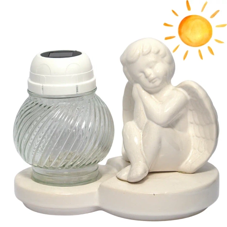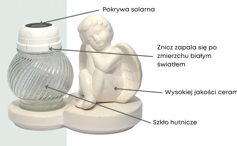 Dekoracyjny znicz solarny z ceramiczną figurką anioła w kolorze białym. Połączenie estetyki i symboliki z praktycznym rozwiązaniem – znicz zapala się automatycznie po zmierzchu, emitując jasne, białe światło. Produkt wykonany z ceramiki i szkła hutniczego, wyposażony w panel zmierzchowy. Idealny na grób dziecka, bliskich lub jako wyjątkowa forma wyrazu pamięci.